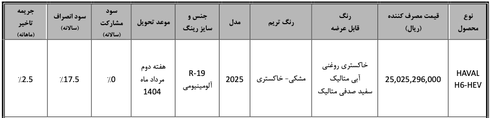 خودرو هاوال H6 هیبرید در این طرح با قیمت قطعی دو میلیارد و ۴۵۰ میلیون تومان و رنگ مشکی و خاکستری با مدل ۲۰۲۴ به خریداران عرضه شد.
