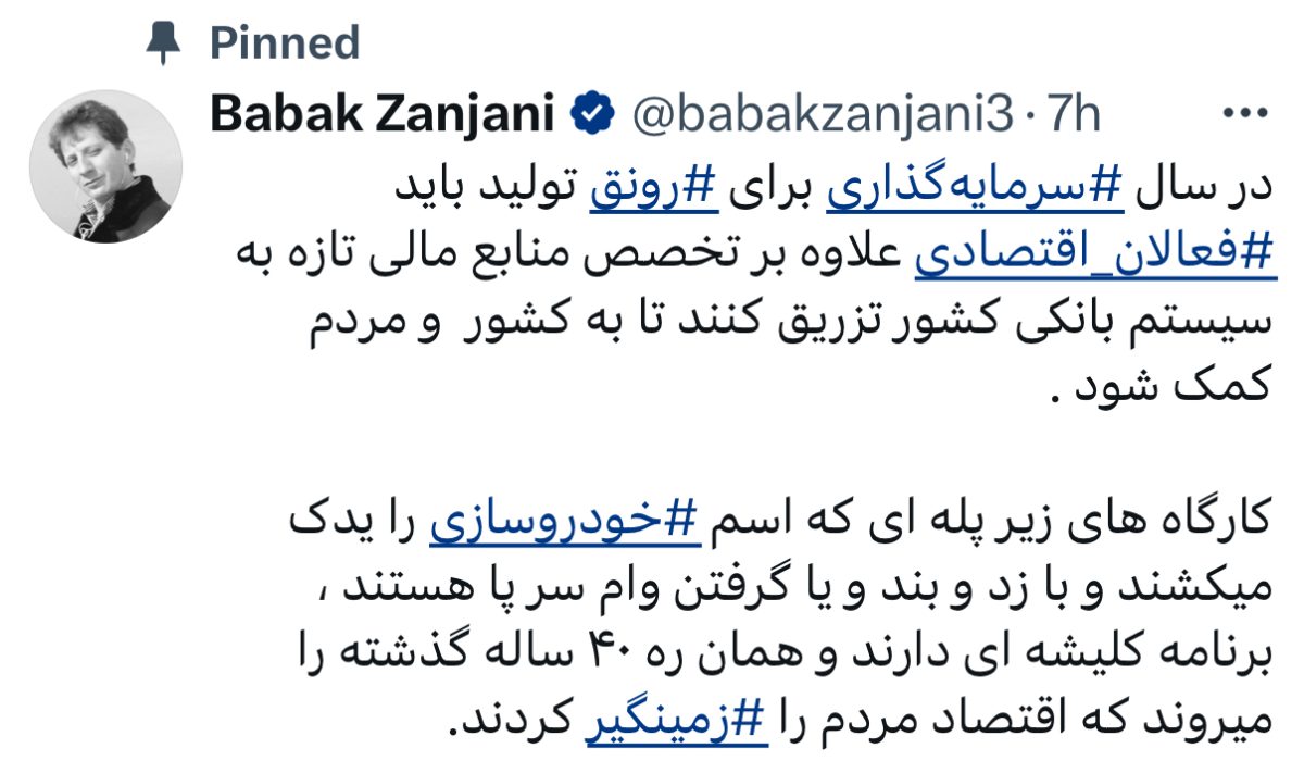 بابک زنجانی در حساب خود در شبکه ایکس گ، توئیتر سابق حسابی از خجالت خودروسازان درآمده است. او در این پست به صراحت آنها را کارگاه های زیرپله ای دانسته که با وام و رانت سرپا ماندهاند. هر چند خودروسازی ایران چندان قابل دفاع نبوده با این وجود به رغم تمام مشکلات واقعا زیرپله ای نیستند. اما چرا زنجانی به خودروسازان توهین می کند؟