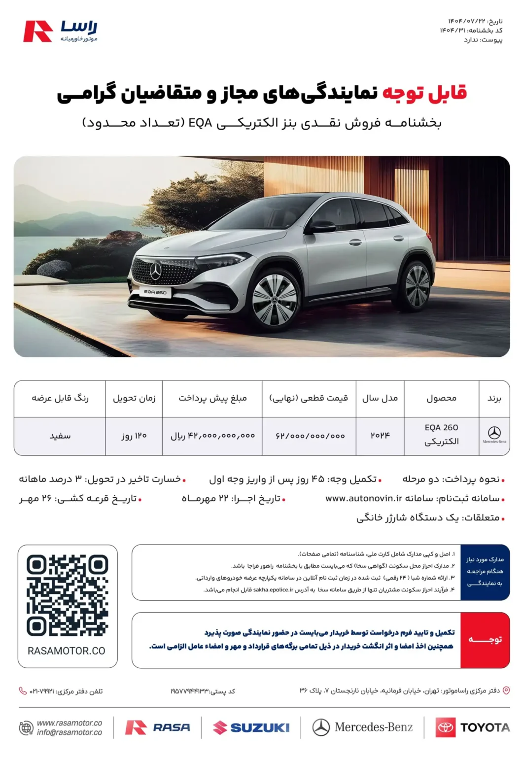 راساموتور خاورمیانه به‌عنوان یکی از شرکت‌های پیشرو در واردات و عرضه خودروهای لوکس، از ۱۲ مهر ۱۴۰۴ عرضه رسمی مرسدس‌بنز برقی EQA را آغاز می‌کند. عرضه این خودرو از طریق سامانه یکپارچه تخصیص خودرو‌های برقی(اتونوین) به‌صورت محدود در اختیار مشتریان عزیز قرار خواهد گرفت. متقاضیان مرسدس بنز EQA از تاریخ مقرر شده می‌توانند با مراجعه به سامانه یکپارچه خودروهای برقی نسبت به ثبت‌نام اقدام کنند.