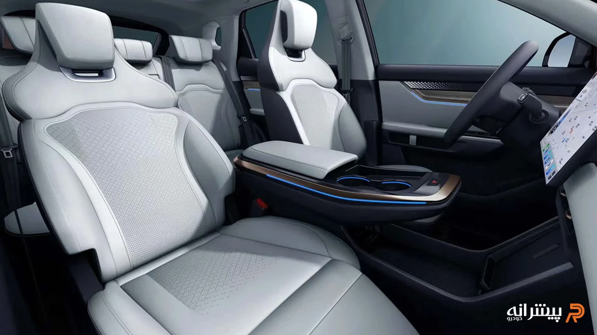 کلاستر راننده دیجیتال حدود ۱۲.۳ اینچ است و طراحی سادهتری نسبت به نمایشگر مرکزی دارد. غربیلک فرمان دو شاخه و دیکات بوده و صندلیهای جلو با روکش چرم مصنوعی، تنظیم برقی و امکانات گرمکن و سردکن عرضه میشوند.