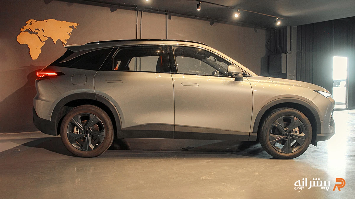 در نمای جانبی، خطوط سیال بدنه همراه با دستگیرههای درب همسطح، رینگهای ۱۹ اینچی دو رنگ و سقف شیبدار به سمت عقب، تعادل خوبی بین زیبایی و پویایی برقرار کرده است. نسخه دورنگ با سقف و آینههای مشکی، ظاهری جوانپسندتر ارائه میدهد. بخش عقب نیز با چراغهای سرتاسری LED، گرافیک داخلی جذاب و دیفیوزر نقرهای، هماهنگی کاملی با جلو دارد و خودرو را پهنتر از واقعیت نشان میدهد.