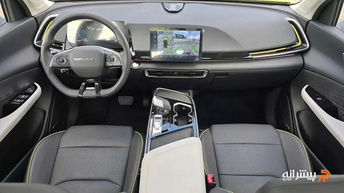 کابین بیجینگ X55 رویکردی مینیمالیستی اما لوکس دارد. داشبورد با خطوط افقی گسترده، حس فضای بیشتری القا میکند و از متریال نرم در بخشهای بالایی و چرم مصنوعی در بخشهای تماس استفاده شده است. دو نمایشگر جداگانه شامل صفحه آمپر دیجیتال ۱۰.۲۵ اینچی و نمایشگر لمسی مرکزی ۱۰.۱ اینچی، بدون یکپارچگی کامل طراحی شدهاند که از تکرار طرحهای رایج چینی فاصله گرفته است.