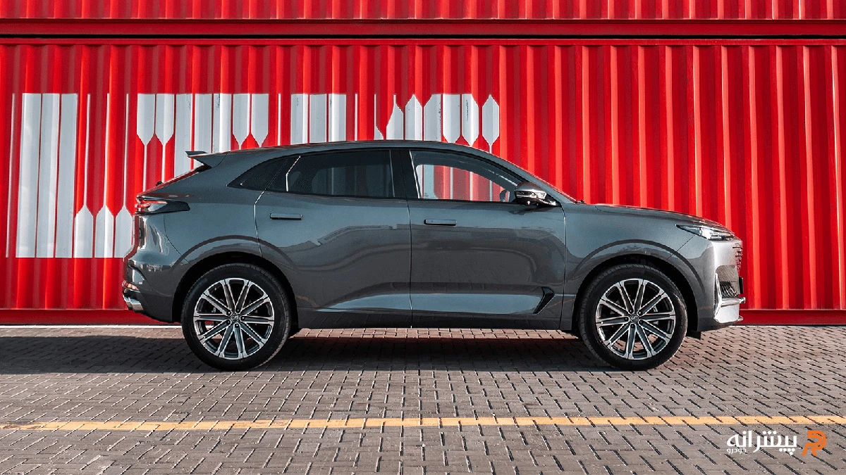 در نمای جانبی، خطوط بدنه با تو رفتگی در بخش میانی ایجاد شده که ظاهری عضلانی و پویا به خودرو میبخشد. دستگیرههای درب مخفیشونده الکترونیکی، رینگهای آلومینیومی ۲۰ یا ۲۱ اینچی و فرم شبهکوپه، حس اسپرت را تقویت میکنند. نمای عقب با چراغهای بههمپیوسته خطی، اسپویلر سقفی و دیفیوزر بزرگ همراه با چهار خروجی اگزوز دوبل، جذابیت بصری بالایی دارد.