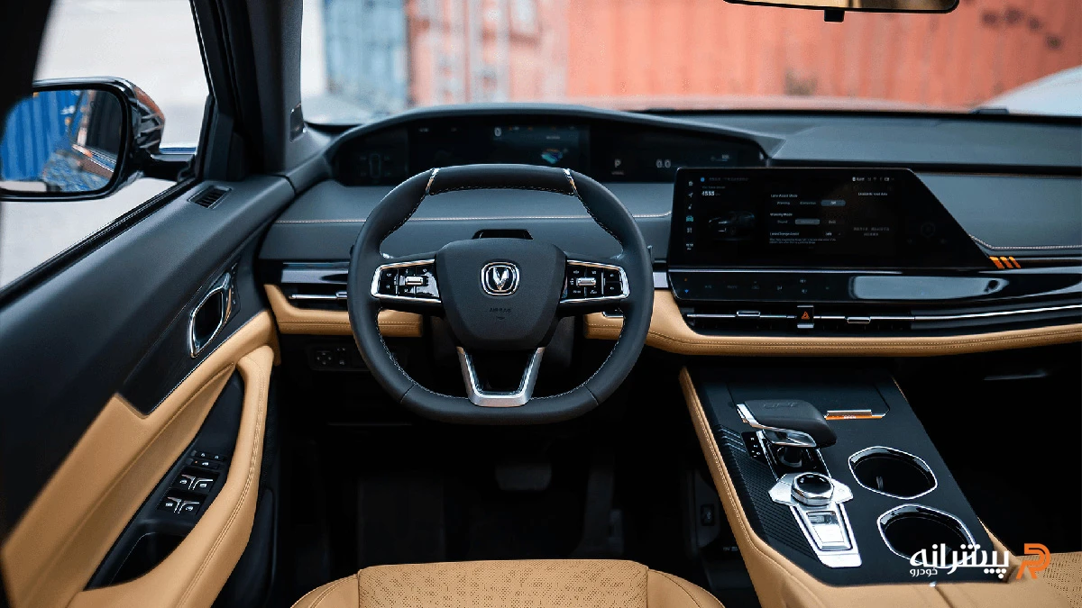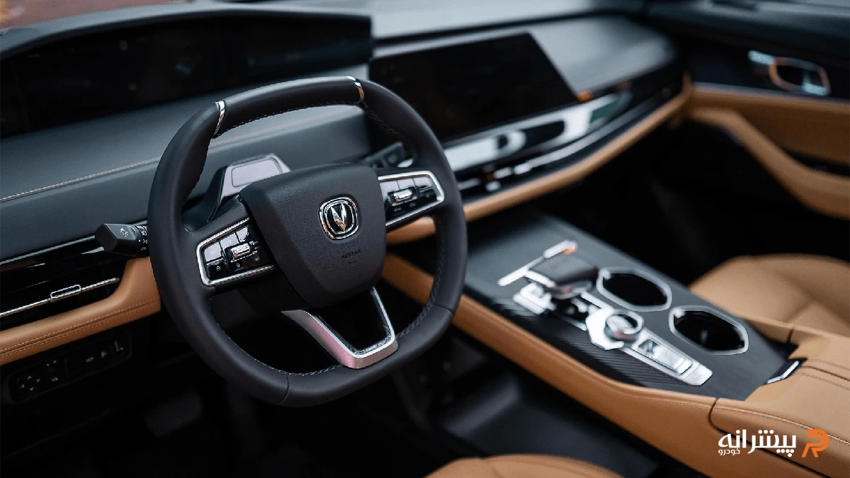 تریم داخلی از ترکیب چرم، پلاستیک پیانویی و پارچه نرم تشکیل شده که کیفیت ساخت بالایی دارد. صندلیها با رنگ مارون و تنظیم برقی، راحتی مناسبی عرضه میکنند. فاصله محوری طولانی، فضای پا و سر فراوانی در ردیف عقب ایجاد کرده و برای پنج سرنشین ایدهآل است. غربیلک فرمان بیضیشکل با بخشهای تخت، ارگونومیک اما ممکن است برای برخی کاربران غیرمعمول باشد. نورپردازی داخلی با ۶۴ رنگ و متریال نرم در رودریها، حس مدرنیته را تقویت میکند.