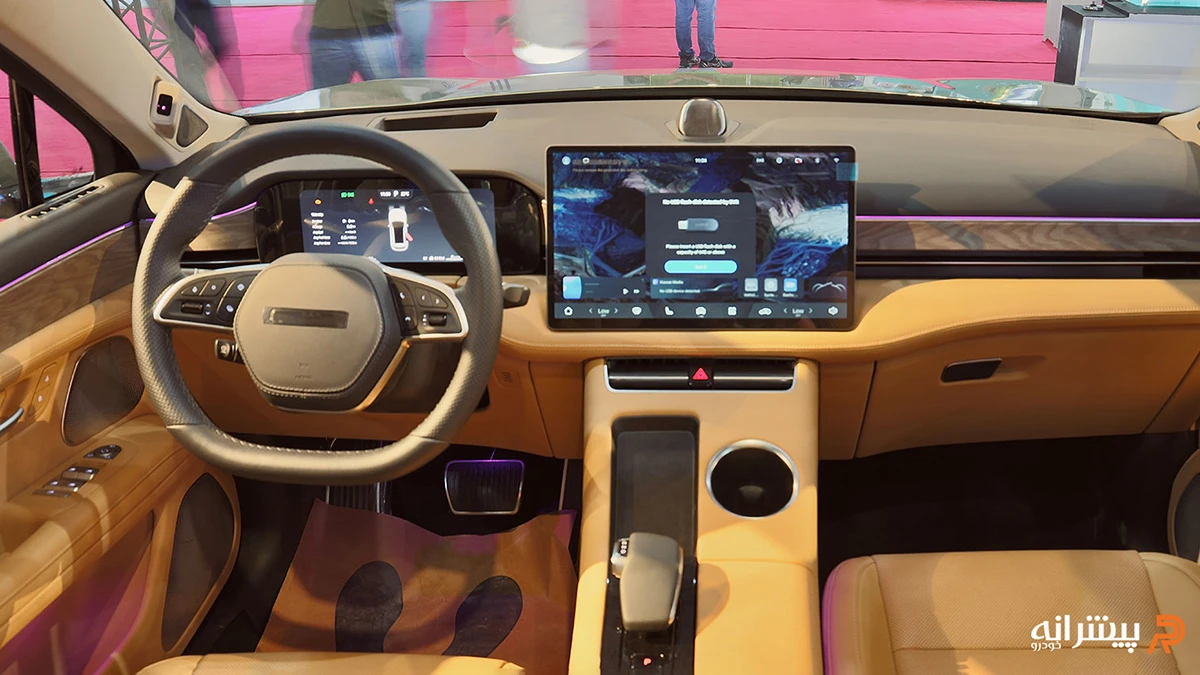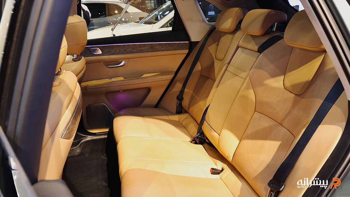 فاصله محوری ۲۸۸۰ میلیمتری، فضای پای کافی برای چهار سرنشین بزرگسال در دو ردیف فراهم میآورد، هرچند ردیف دوم بیشتر برای استفاده خانوادگی مناسب است. نورپردازی داخلی چندرنگ و سقف پانوراما، حس لوکس بودن را افزایش میدهد. کنسول میانی با سلکتور الکترونیکی دنده و شارژر بیسیم، ارگونومی را بهبود بخشیده است. حجم صندوق عقب حدود ۳۷۰ لیتر در حالت استاندارد، برای حمل بار روزانه کافی اما نه بیش از حد جادار است. در کل، طراحی داخلی بر راحتی طولانیمدت و ادغام فناوری تمرکز دارد.