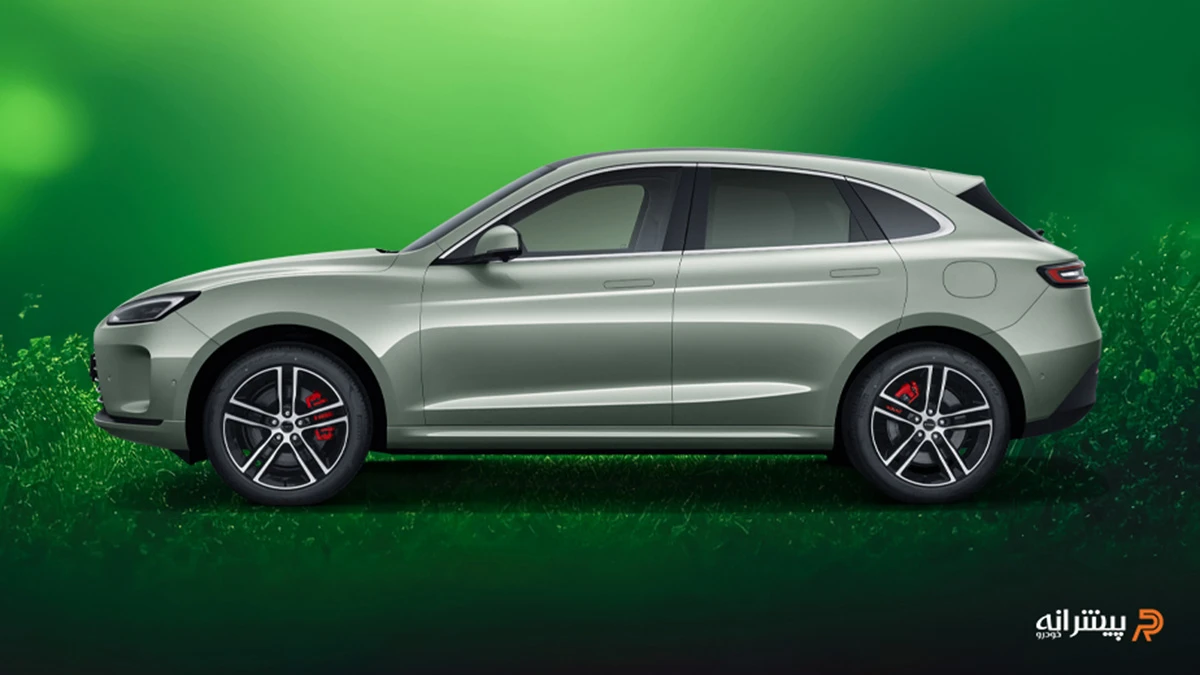 در بخش جلو، چراغهای Full LED نواری پیوسته با جلوپنجره بسته و ورودیهای هوای عمودی در سپر، ظاهری مینیمال و تکنولوژیک القا میکنند. دستگیرههای مخفیشونده و رینگهای ۲۰ اینچی با طراحی آئرودینامیک در نمای جانبی، حس اسپرت و پویایی را تقویت مینمایند. شیب ملایم سقف به عقب و خط شانه کشیده، هماهنگی بصری را افزایش داده است.