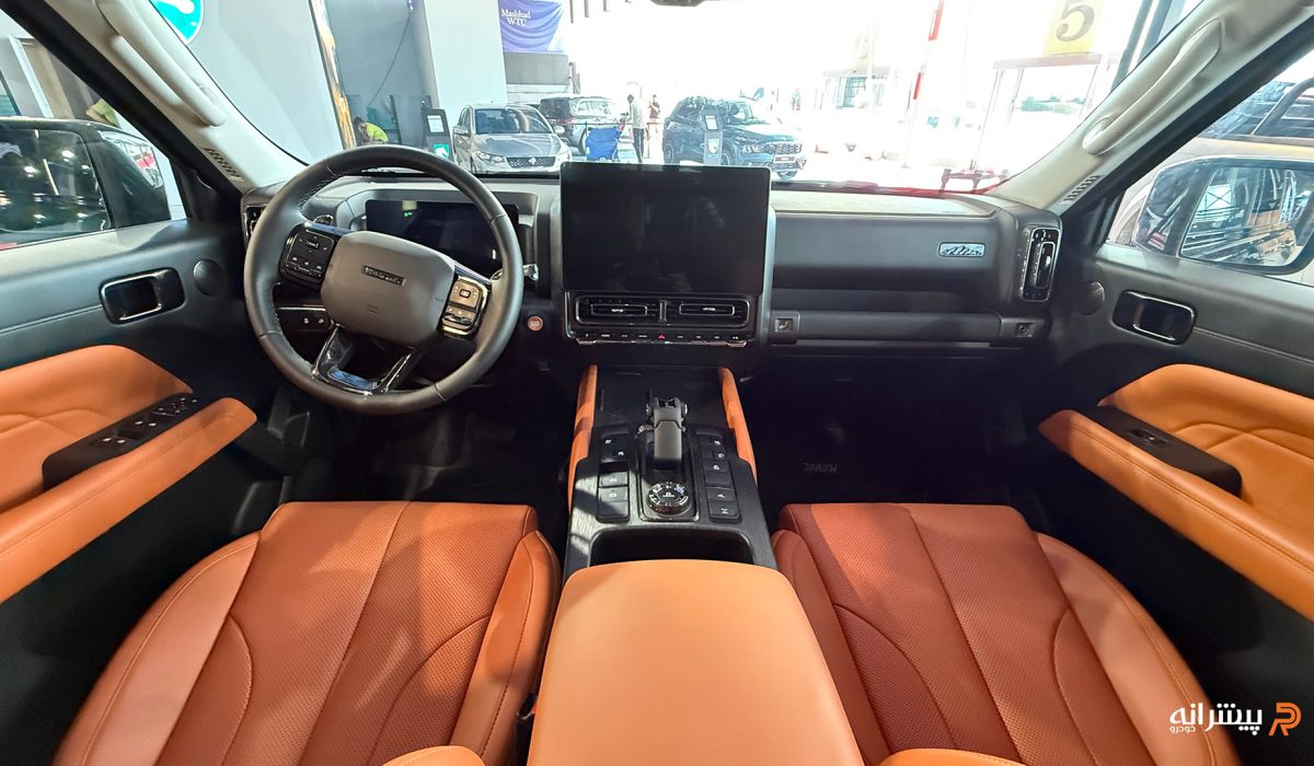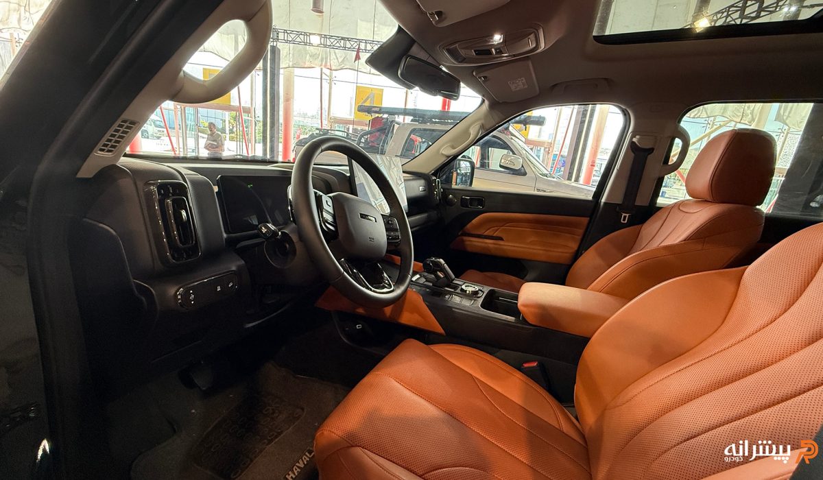 کابین هاوال H9 مدل ۲۰۲۴ برخلاف بسیاری از خودروهای مدرن چینی، همچنان شخصیت یک آفرودر واقعی را حفظ کرده است. تریم داخلی دورنگ مشکی و قهوه ای جلوه ای لوکس به فضا داده و استفاده از کلیدهای فیزیکی متعدد برای کنترل سیستم ها، کاربری ساده و قابل اعتماد را تضمین می کند. نمایشگر مرکزی ۱۴.۶ اینچی و صفحه آمپر دیجیتال ۱۲.۳ اینچی، جلوه ای مدرن به داشبورد بخشیده اند. غربیلک فرمان سه شاخه، شیفتر دنده جدید و کنسول میانی پر دکمه، حس یک خودروی کاربردی را منتقل می کنند. همچنین کیفیت متریال داخلی، طراحی ارگونومیک صندلی ها و بهره گیری از امکاناتی مانند کول باکس و شارژر بی سیم، راحتی سفرهای طولانی را تضمین می کنند.