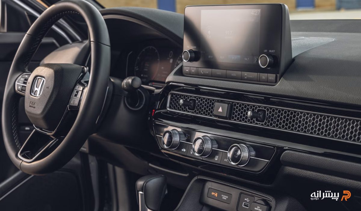 کابین هوندا سیویک ۲۰۲۴ با رویکردی مینیمال و ارگونومیک طراحی شده است، خطوط افقی ممتد در داشبورد، حس فضای باز و پهنای بیشتر را به سرنشینان القا می کند. دریچه های تهویه یکپارچه با شبکه مشبک فلزی، جلوه ای زیبا و هماهنگ به کابین بخشیده است. نمایشگر لمسی ۹ اینچی در مرکز داشبورد، به همراه پشت آمپر دیجیتال ۷ اینچی، اطلاعات رانندگی را با وضوح بالا نمایش می دهد. استفاده از متریال باکیفیت، مانند روکش های نرم و پلاستیک های مرغوب در بخش های داشبورد و کنسول میانی، حس پریمیوم را منتقل می کند. جزئیات کرومی ظریف در بخش هایی از فرمان و کنسول، جذابیت بصری کابین را افزایش داده است.