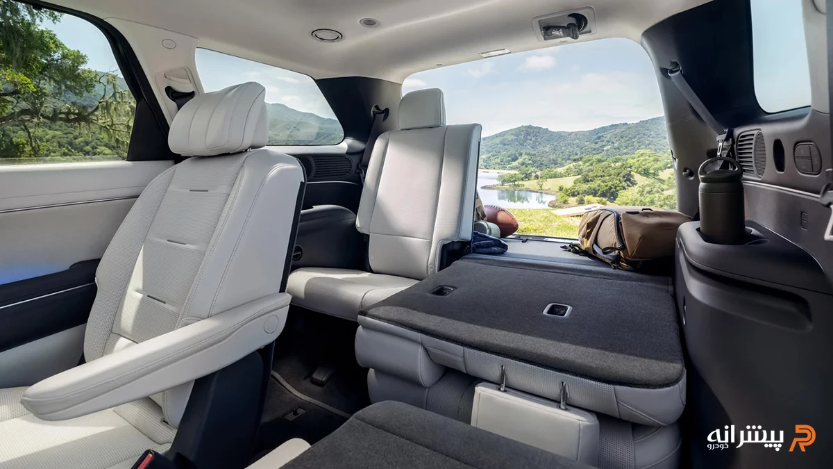 ردیف دوم در تیپهای هفتنفره صندلیهای مستقل با قابلیت ماساژ دارد. فرمان فاقد نشان H مرکزی است و بهجای آن چهار نقطه کد مورس بهکار رفته. فضای پا و سر در ردیفهای دوم و سوم بهدلیل افزایش فاصله بین محورها بهبود یافته و امکانات استاندارد شامل نمایشگر هدآپ، سانروف دوتکه و نورپردازی محیطی است.