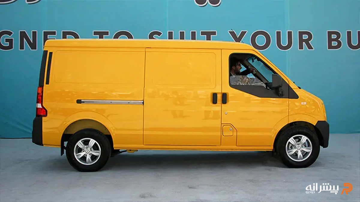 نمای جلو طراحی سادهای دارد و چراغهای عمودی آن یادآور خودروهای تجاری شرق آسیاست. سپر و جلوپنجره بدون جزئیات تزئینی خاص طراحی شدهاند و تمرکز اصلی بر کارایی است. آینههای جانبی بزرگ، میدان دید مناسبی برای راننده فراهم میکنند که در تردد شهری و مانور در فضاهای محدود اهمیت بالایی دارد. وجود دربهای کشویی در هر دو سمت بدنه و درب عمودی بزرگ عقب، یکی از نقاط قوت طراحی بدنه محسوب میشود و انعطافپذیری بالایی در بارگیری از جهات مختلف ایجاد میکند.