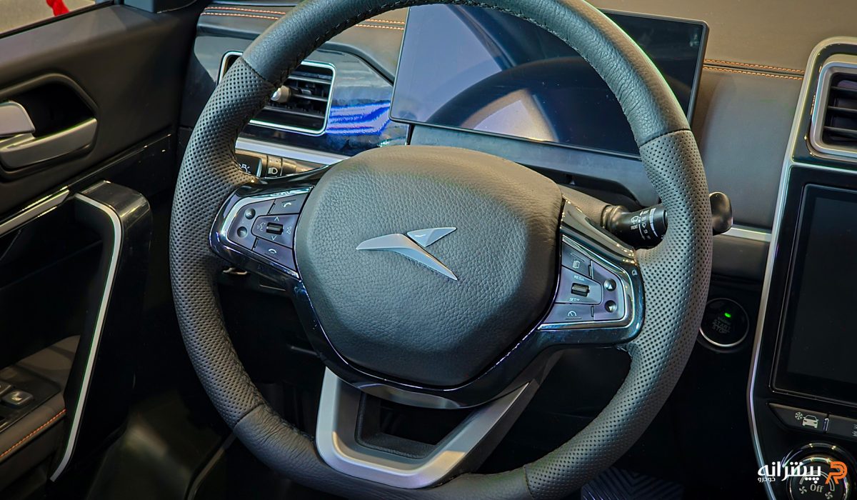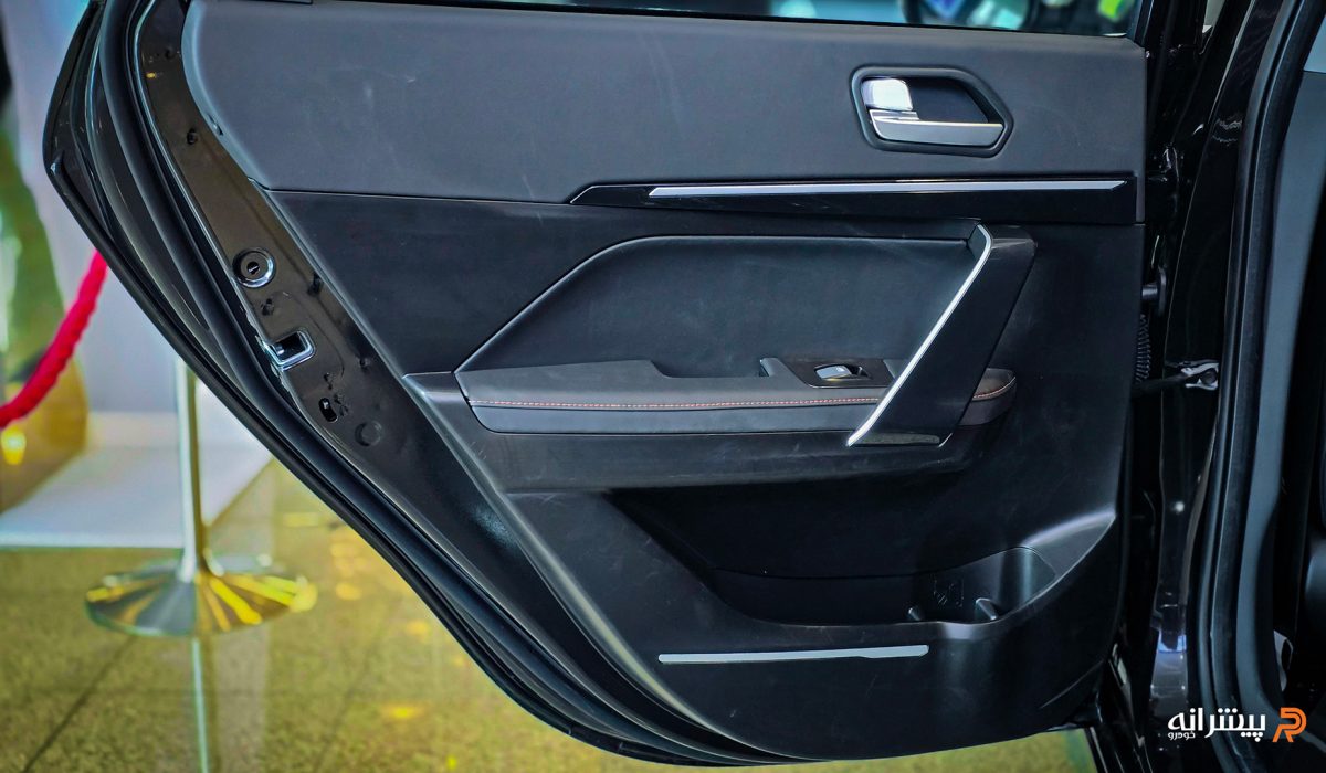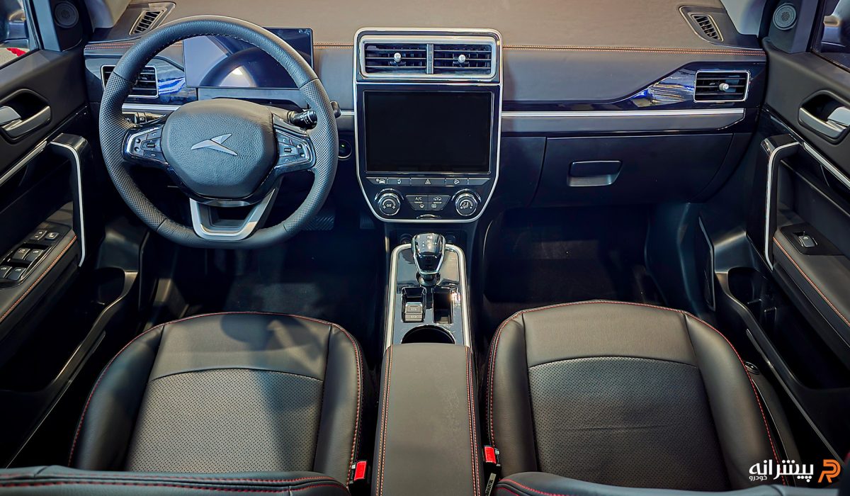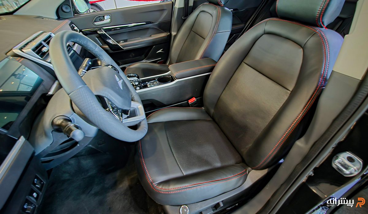 کنسول میانی با دسته دنده الکتریکی و ترمز پارک برقی ، فضایی مدرن و جادار ایجاد کرده است. فرمان D-Cut با روکش چرمی و کلاستر دیجیتال، تجربه رانندگی اسپرتی را تقویت می کند. صندلی ها با روکش چرم منفذدار و تنظیم برقی ۶ جهته برای راننده و سرنشین جلو ، راحتی مناسبی دارند، هرچند فضای سرنشینان عقب برای افراد بلندقد ممکن است کمی محدود باشد. طراحی کابین با استفاده از المان های چهارضلعی و خطوط کرومی ، حس نوستالژیک و مدرنیته را به خوبی ترکیب کرده و ارگونومی کلی آن، از جمله دسترسی به کنترل های تهویه مطبوع فیزیکی، برای راننده مناسب است.