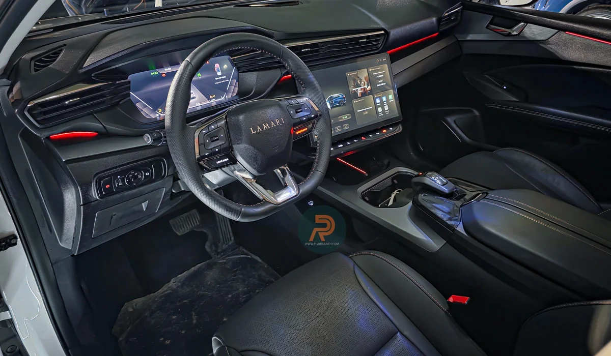 کابین لاماری هیرکانی با رویکرد مینیمال و کاربردی طراحی شده و از متریالهایی مانند چرم مصنوعی با دوخت ظریف و تریمهای طرح فلز بهره میبرد. داشبورد چندسطحی با انحناهای نرم، حس پهنا را افزایش میدهد و ترکیب رنگها، محیطی مدرن ایجاد میکند. نمایشگر لمسی بزرگ مرکزی، سیستمهای چندرسانهای و تهویه را یکپارچه کنترل میکند، در حالی که حذف کلیدهای فیزیکی و استفاده از دکمههای لمسی، فضایی شبیه به خودروهای اروپایی فراهم کرده است.