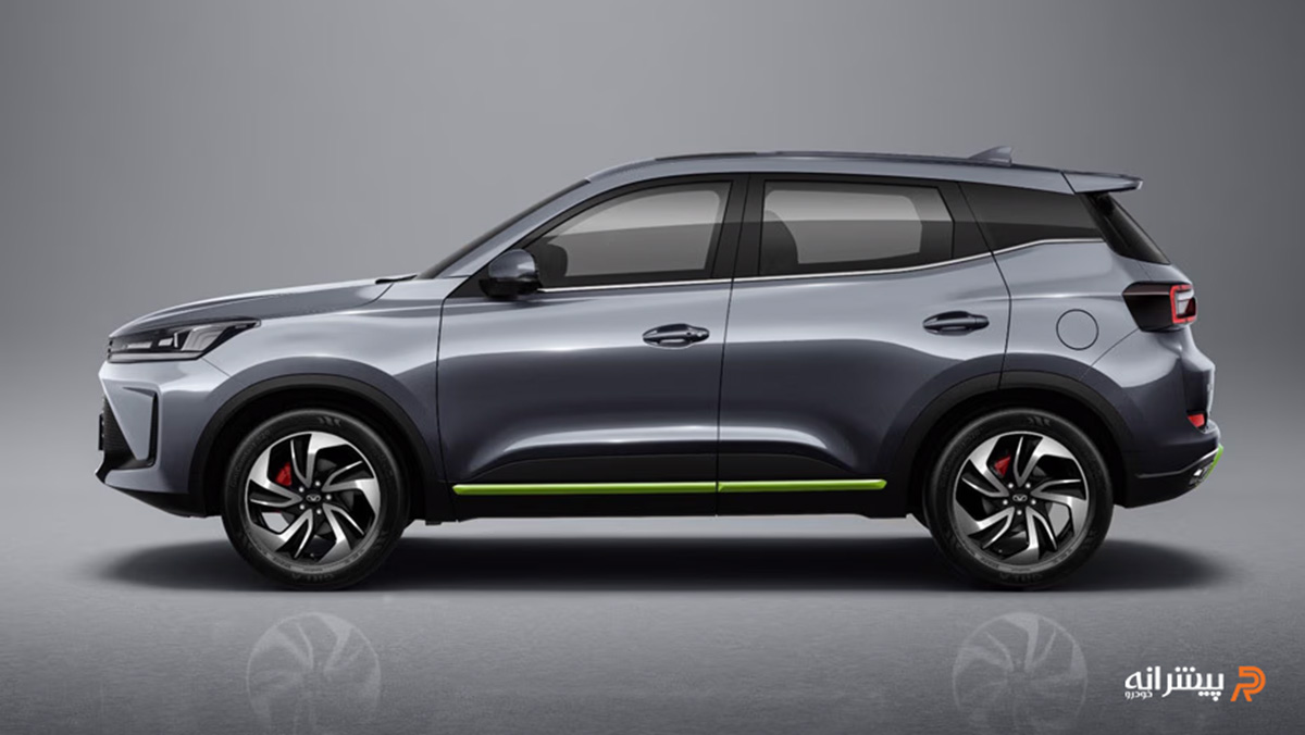 در نمای جانبی، شیشههای کشیده با قاب کرومی و خط شانه ملایم، حالت عضلانی به بدنه میبخشد. رینگهای آلیاژی چندپرهای، حس حرکت را حتی در حالت سکون القا میکنند. خط سقف شیبدار، فرم اسپرتتری ایجاد مینماید. نمای عقب با چراغهای LED کشیده و سپر هماهنگ، پایداری را نشان میدهد، در حالی که لوگوی کوچک و خطوط درب صندوق، ظاهری مینیمال ارائه میکنند.