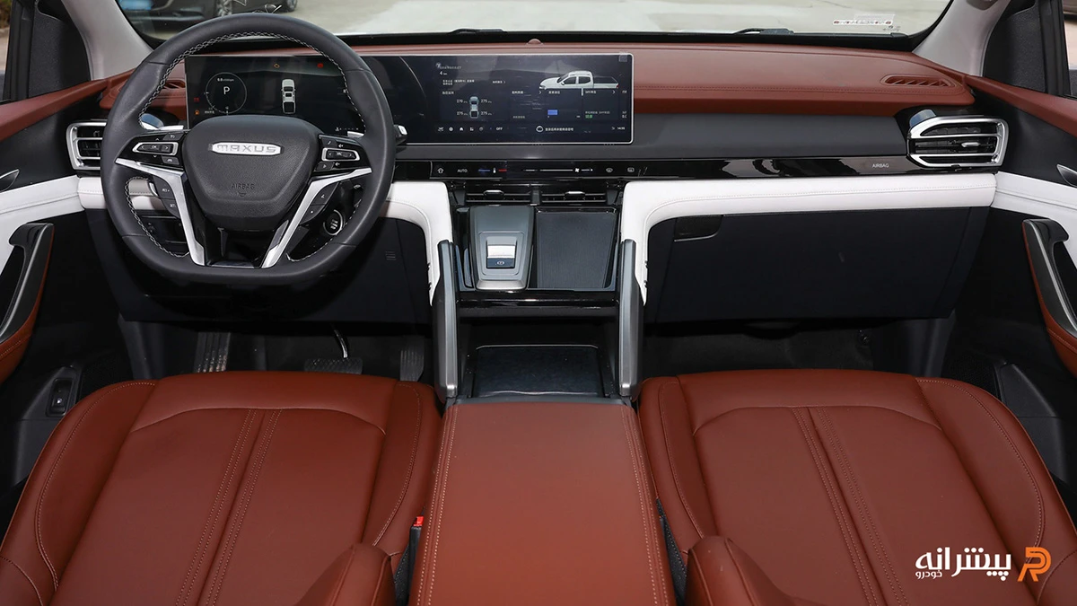 کابین مکسوس استار H یکی از نقاط قوت اصلی آن محسوب میشود و برخلاف بسیاری از پیکاپهای چینی، حس یک خودروی کار و تجاری خشک را منتقل نمیکند. داشبورد با خطوط افقی و دو نمایشگر ۱۲.۳ اینچی یکپارچه (کلاستر دیجیتال + سیستم مالتیمدیا) طراحی مدرنی دارد. فرمان D-cut با روکش چرم و پدلشیفتر، دستهدنده الکتریکی پشت فرمان و کنسول میانی مورب از جمله جزئیات جذاب هستند.