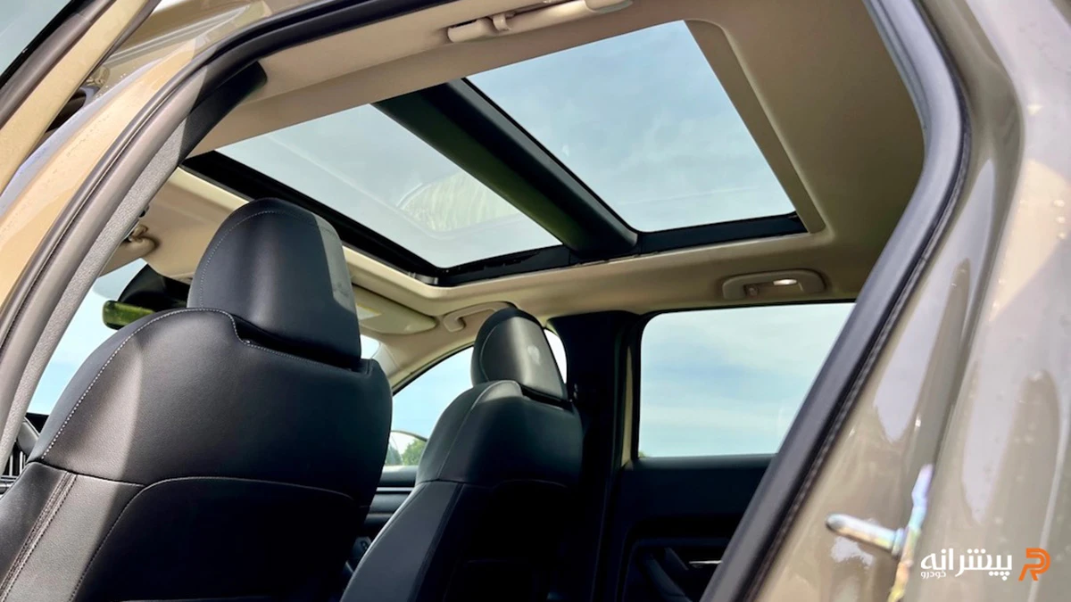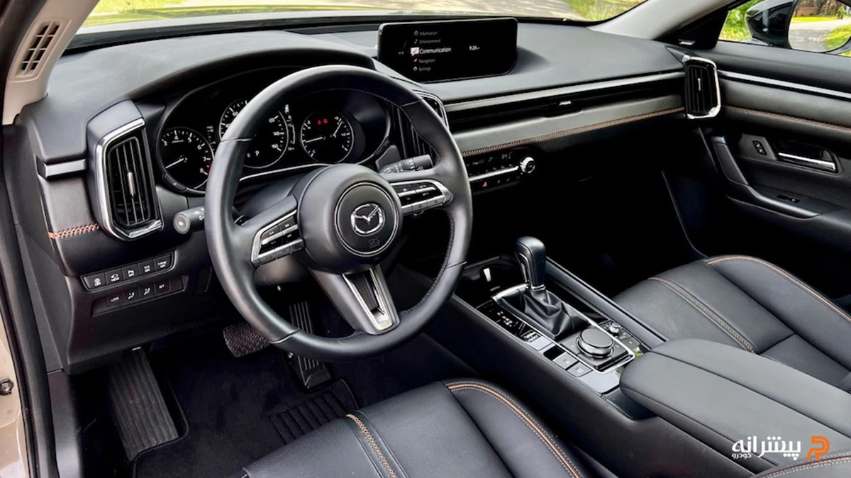 نمایشگر مرکزی ۱۰.۲۵ اینچی شناور در بالای داشبورد قرار گرفته و سیستم Mazda Connect را میزبانی میکند. فضای ردیف عقب برای سرنشینان بزرگسال کافی است و صندلیهای عقب با تا شدن مسطح، ظرفیت صندوق را به بیش از ۵۳۰ لیتر افزایش میدهند. متریال نرم در بخشهای تماس دست و پلاستیک باکیفیت در رودریها، سطح کیفی کابین را بالا میبرند. نورپردازی LED داخلی و کنسول میانی متمایل به راننده، حس لوکس و رانندهمحور را تقویت میکنند، هرچند ارتفاع سقف نسبتا پایین ممکن است برای برخی کاربران حس تسلط کامل یک SUV بزرگ را کاهش دهد.