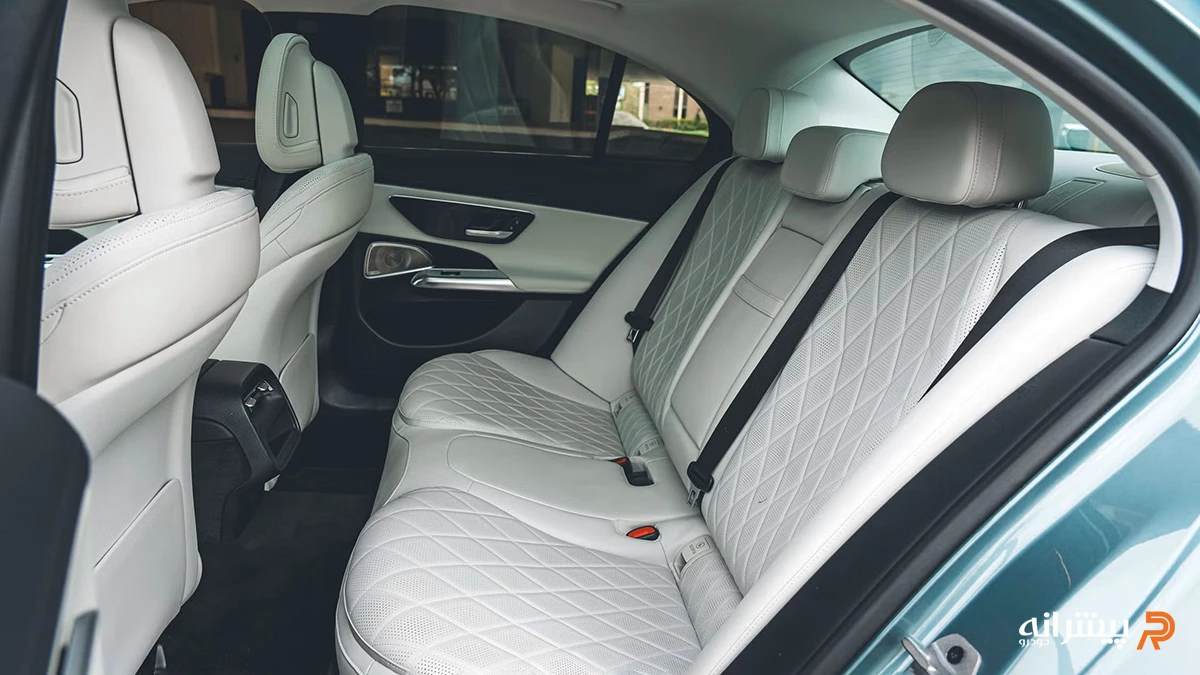 در نمای جانبی، خط شانه ممتد و فاصله محوری بلند، ظاهر کشیده و متوازن خودرو را تقویت میکند. رینگهای ۲۰ اینچی با پر کردن فضای گلگیرها، تناسبات بدنه را کاملتر نشان میدهند. در عقب، چراغهای باریک با امضای نوری الهامگرفته از نشان سهپر مرسدس، هویت بصری نسل جدید را شکل میدهند. طراحی سپر و یکپارچهسازی خروجیهای اگزوز نیز رویکردی مینیمالتر نسبت به نسلهای قبل دارد.
