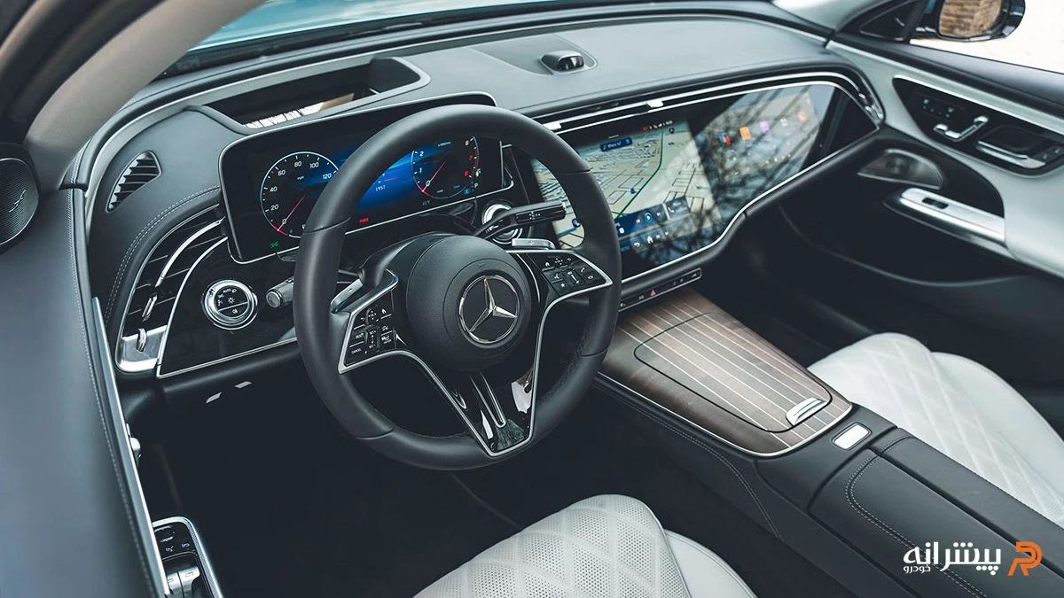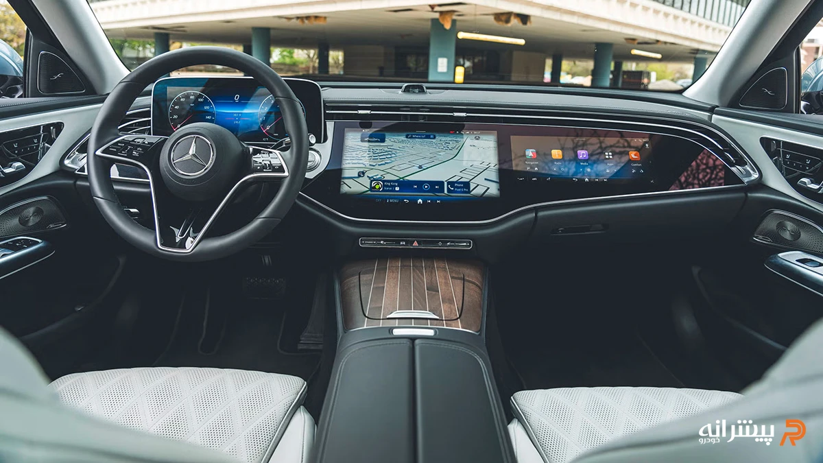 کابین E300 ۲۰۲۶ بر محور دیجیتالیسازی گسترده شکل گرفته است. داشبورد ساختاری یکپارچه دارد و سه نمایشگر شامل کلاستر ۱۲.۳ اینچی، نمایشگر مرکزی ۱۴.۴ اینچی و نمایشگر ۱۲.۳ اینچی سرنشین جلو در قالب مجموعهای پیوسته موسوم به MBUX Superscreen ارائه میشوند. این چیدمان، تمرکز کنترلها را به بستر لمسی و گرافیکی منتقل کرده و بخش عمده تعامل کاربر با خودرو از طریق همین نمایشگرها انجام میشود.