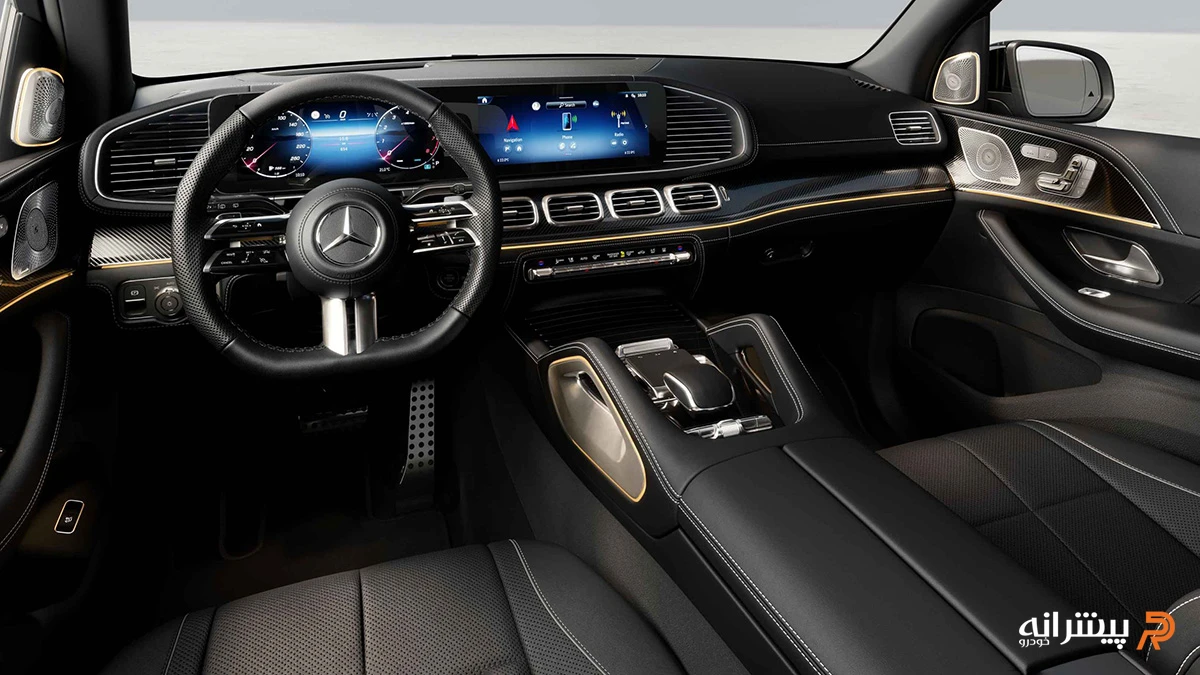 کابین GLS 450 مبتنی بر زبان طراحی دیجیتال جدید مرسدسبنز شکل گرفته است. نمایشگر عریض یکپارچه متشکل از دو صفحه ۱۲.۳ اینچی با رابط کاربری MBUX، هسته اصلی تعامل راننده با خودرو را تشکیل میدهد. ساختار افقی داشبورد و دریچههای تهویه مستطیلی، حس عرض بیشتر را القا میکند و چیدمان ادوات کنترلی بهگونهای است که دسترسی سریع به تنظیمات اصلی فراهم باشد.