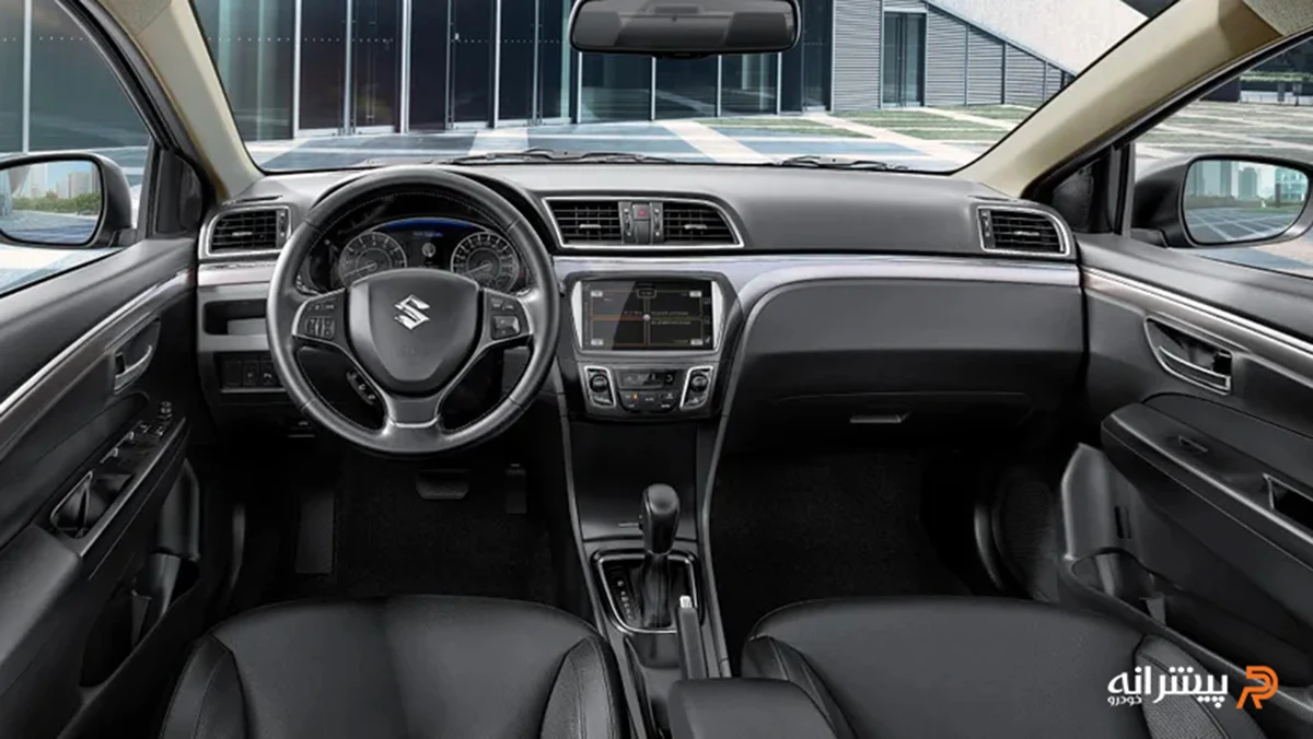 فضای کابین سوزوکی سیاز با رویکرد مینیمال و کاربردی طراحی شده و از مواد پلاستیکی سخت اما با مونتاژ قابل قبول استفاده می کند. داشبورد خطوط صاف و سادهای دارد و نمایشگر لمسی ۷ اینچی در مرکز کنسول قرار گرفته است. غربیلک فرمان سهشاخه با دکمههای کنترلی، کلاستر آنالوگ همراه با نمایشگر ۴.۲ اینچی کامپیوتر سفری و پنل تهویه اتوماتیک، ترکیب آشنایی را شکل میدهند.