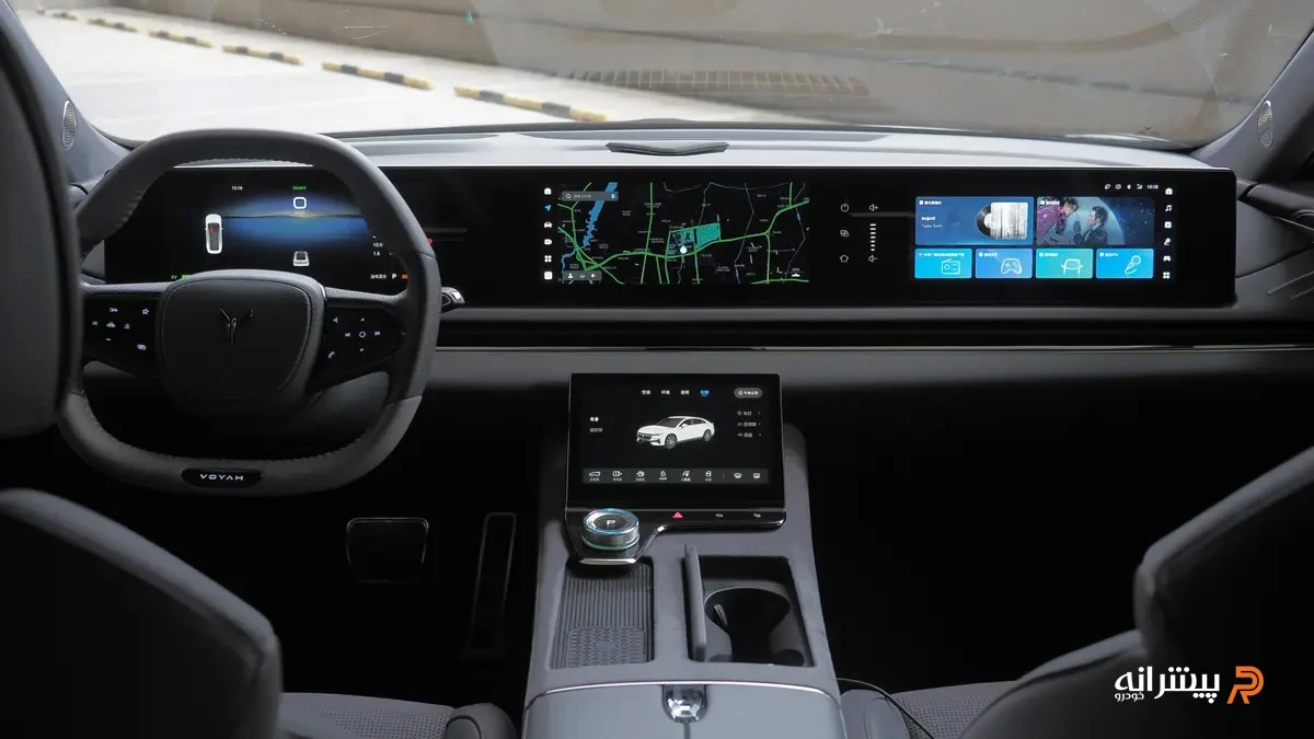 کابین وویا پشن یکی از نقاط قوت اصلی آن محسوب میشود. سه نمایشگر ۱۲.۳ اینچی یکپارچه در جلو (کلاستر دیجیتال، مالتیمدیا و نمایشگر اختصاصی سرنشین کناری) تصویری مینیمال و پیشرفته خلق کردهاند. متریال بهکاررفته شامل چرم ناپا، آلکانتارا و تزئینات فلزی باکیفیت است. صندلیها ارگونومیک و بسیار راحت طراحی شدهاند و فاصله محوری ۳ متر فضای پای بسیار خوبی بهویژه برای سرنشینان عقب فراهم میکند.